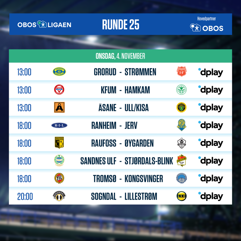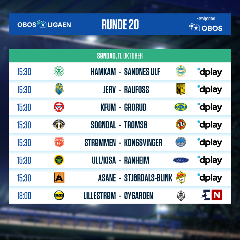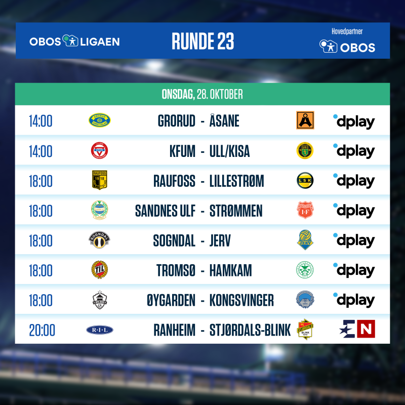 | KFUM Oslo | - | HamKam | Onsdag 1300 | Dplay |