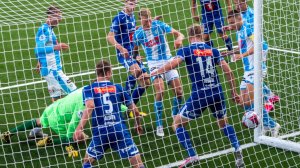 Etter å ha fått 4-0 i sekken borte mot Strømmen, var det en revansjesugen gjeng som tok i mot fjorårets eliteserielag Ranheim. Da dommer blåste av etter 95 spilte minutter kunne de lyseblå juble for 2-1 seier. Foto: Nanco Hoogstad.